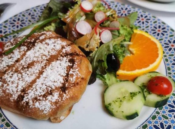 Меню: свежевыпеченные багеты, марокканские блины бэгрир, мед, фрукты, омлеты, йогурты, фреши