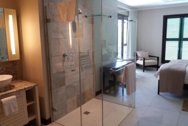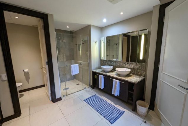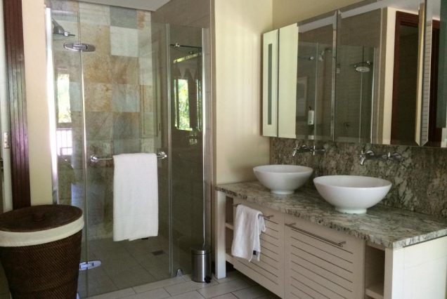 Санузел: просторный, с тропическим душем, ванной, двойной раковиной, натуральной косметикой