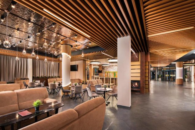 Панорама и архитектура: горы Родопы, леса и луга, отель в стиле современной болгарской архитектуры с элементами природных материалов, большие окна, просторные террасы.