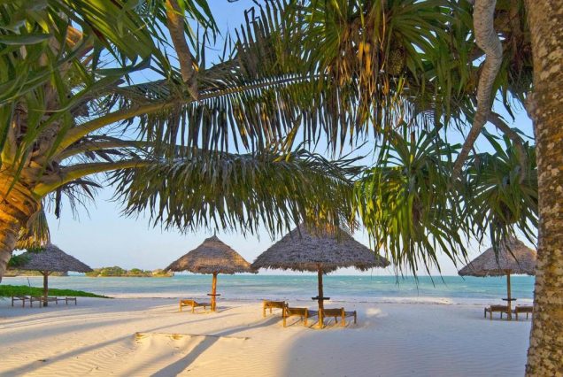 Панорама и архитектура: традиционные занзибарские виллы с соломенными крышами, белоснежные пляжи, лазурный океан, тропическая зелень