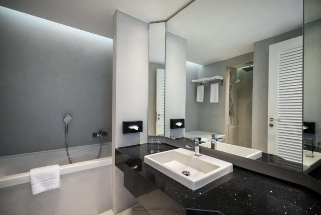 Санузел: просторная ванна, душевая с тропическим душем, двойная раковина, биде