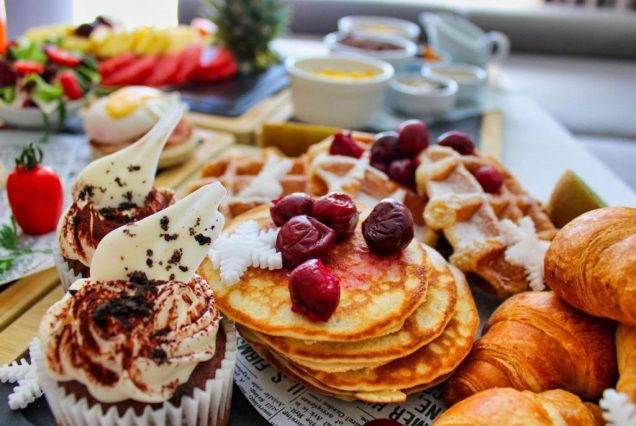Меню: свежие фрукты, сырники, болгарский йогурт, круассаны, омлеты, мёд, выпечка, каши