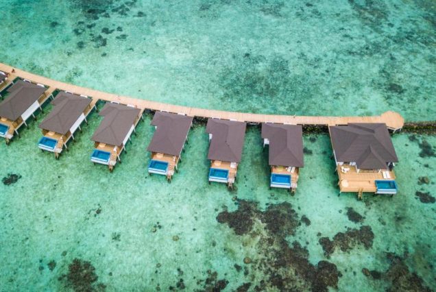 Панорама и архитектура: виллы на воде и пляже, кристально чистая лагуна, белоснежный песок