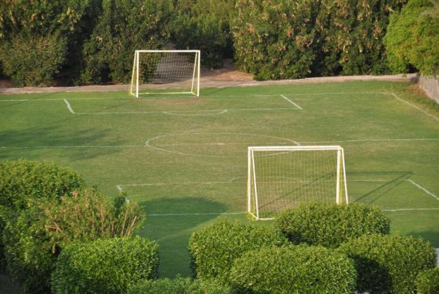 — Просторная зелёная территория с пальмами и тенистыми зонами