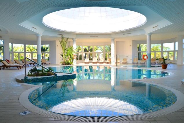 Бассейны: большой открытый бассейн с эффектом лагуны, крытый бассейн, детский бассейн; шезлонги и зонты включены.