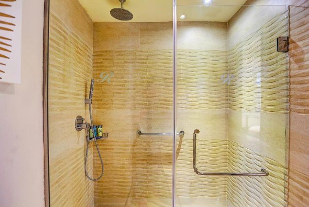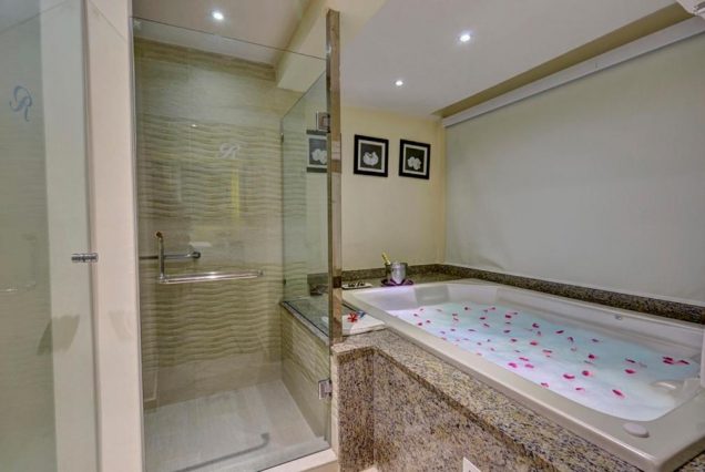 Санузел: ванна с джакузи, отдельный тропический душ, двойная раковина