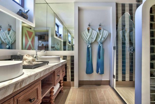 Санузел: открытая ванная зона под небом, тропический душ, ванна, двойная раковина