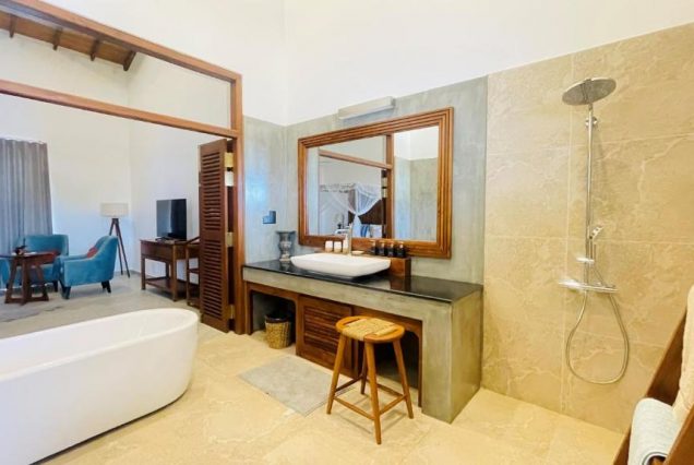 Санузел: открытая ванна с видом на океан, тропический душ, премиум-косметика