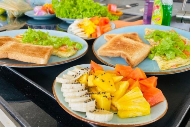 Меню: свежие тропические фрукты, хлеб из печи, яйца (любые), дахи, кокосовые блины, смузи-боулы