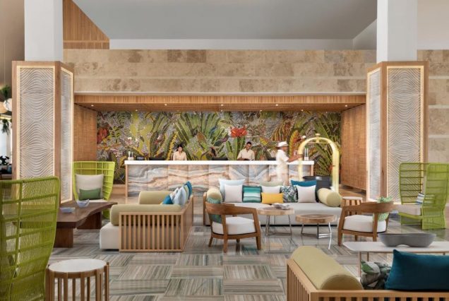 Панорама и архитектура: тропические сады, пальмы, бирюзовое море, виллы и лаунжи в стиле карибской элегантности