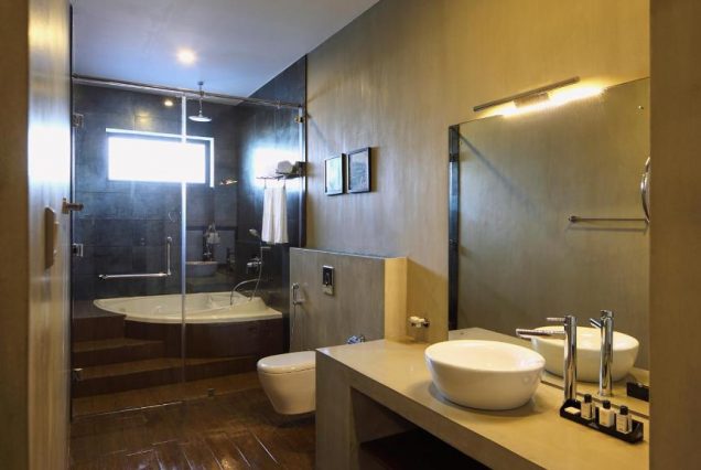 Санузел: ванна с гидромассажем, душевая зона с тропическим душем, двойная раковина, туалет и биде