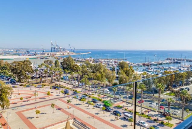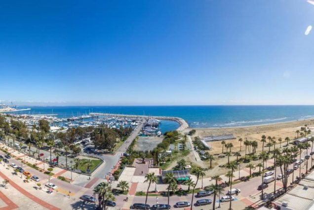 Панорама: Средиземное море, пальмы, яхты, архитектура Ларнаки
