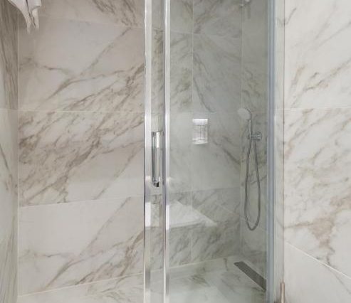 Санузел: душ или ванна, мраморная отделка, комплект полотенец