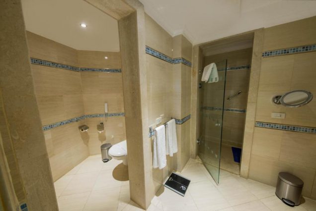 Санузел: ванна с гидромассажем, душевая кабина с тропическим душем, двойная раковина, туалетные принадлежности премиум-класса