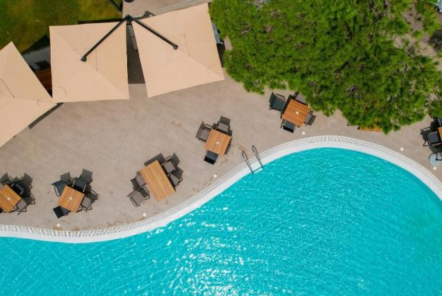 На территории: открытый бассейн с террасой, собственный песчаный пляж с шезлонгами и зонтами