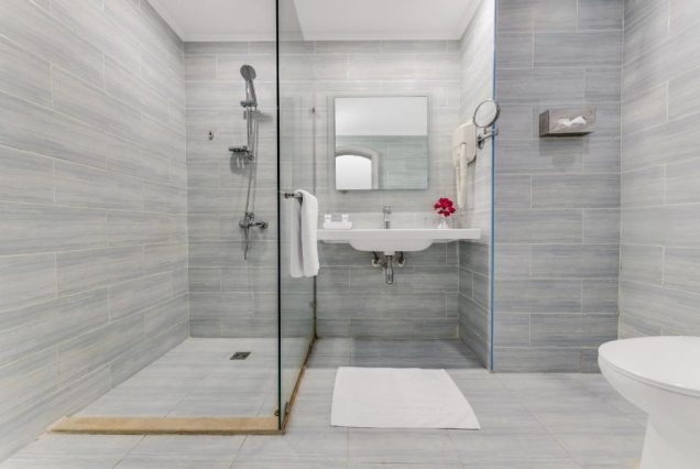 Санузел: душевая кабина, ванна, раковина, фен, набор полотенец
