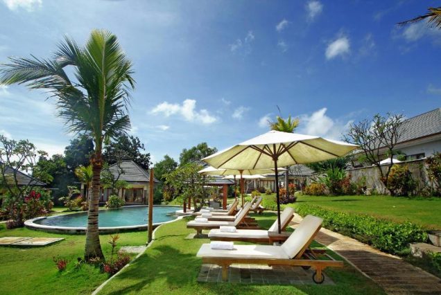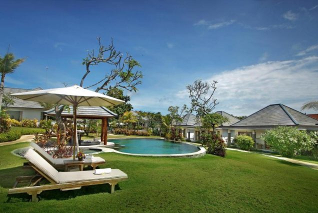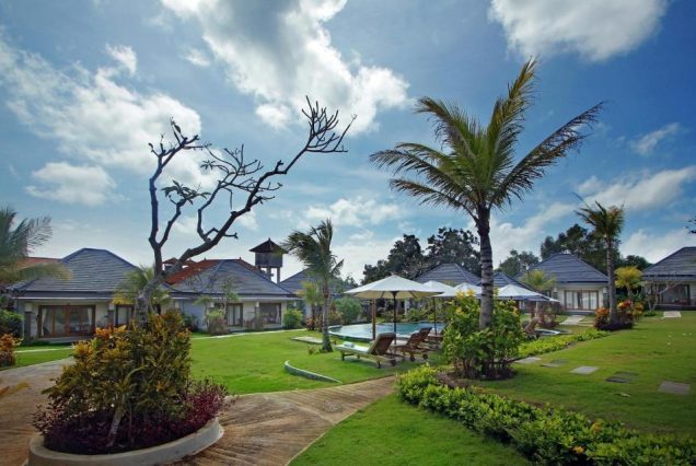 Локация: Индонезия, Бали, район Джимбарана, на побережье, окружённый зеленью и тропическими садами.