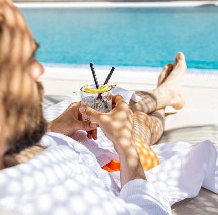 — Свободное время у infinity-бассейна, шезлонги и прохладительные напитки