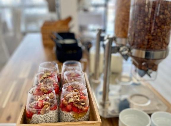 Меню: свежие сезонные овощи и фрукты, яйца (любые виды), выпечка, домашние джемы, смузи, органический кофе и чай