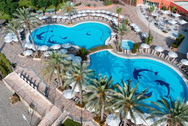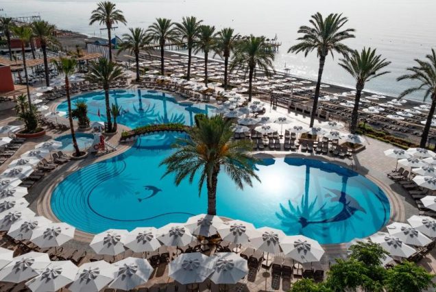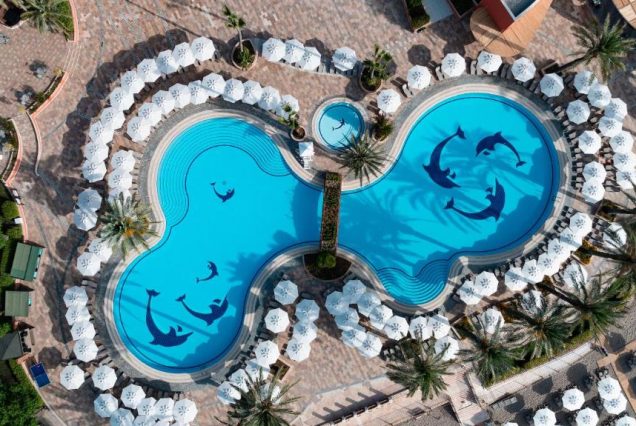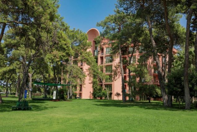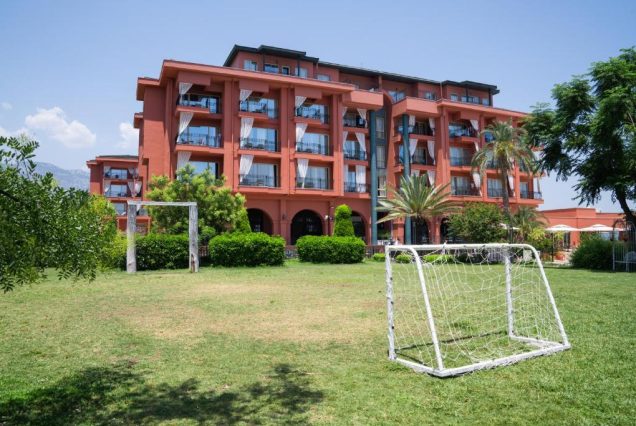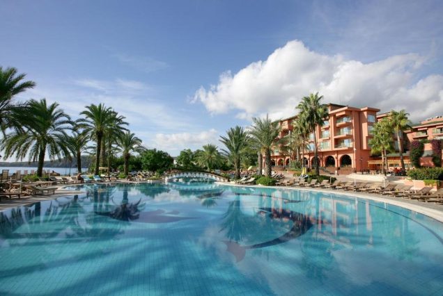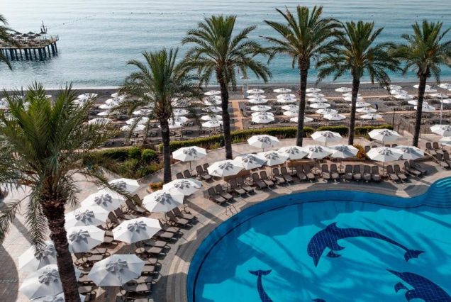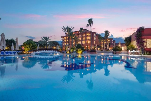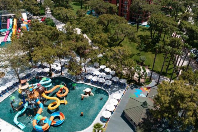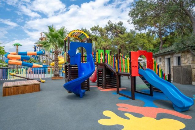 На территории: 4 ресторана (основной + à la carte), 5 баров, аквапарк с горками, открытые и крытые бассейны, большой SPA-центр (хамам, сауна, джакузи, массажи), фитнес-зал, мини-гольф, теннис, вечерняя анимация и клуб.