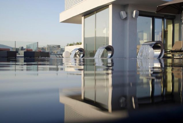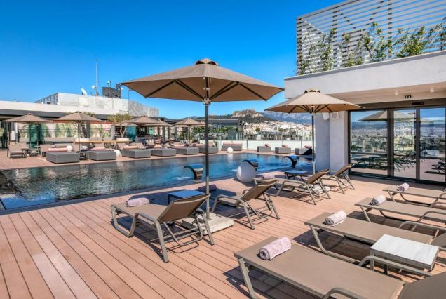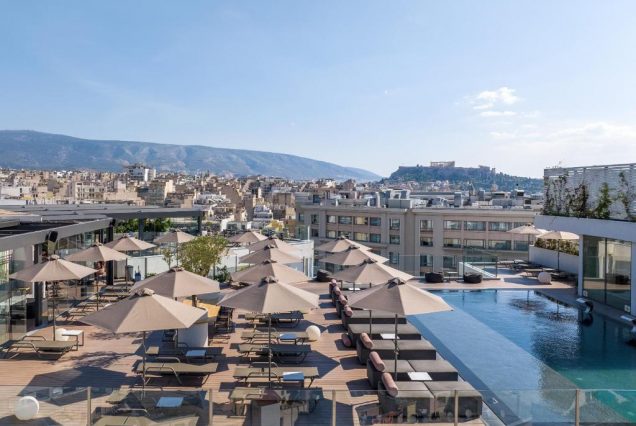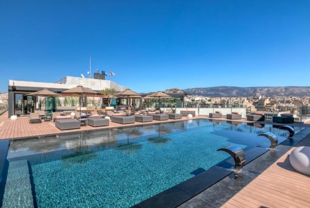 Бассейны: rooftop-бассейн с видом на Акрополь, шезлонги и обслуживание включены.