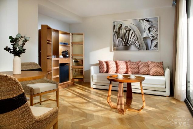 Оснащение: Smart TV, Bluetooth-колонка, кофемашина Nespresso, мини-бар, сейф, гладильные принадлежности