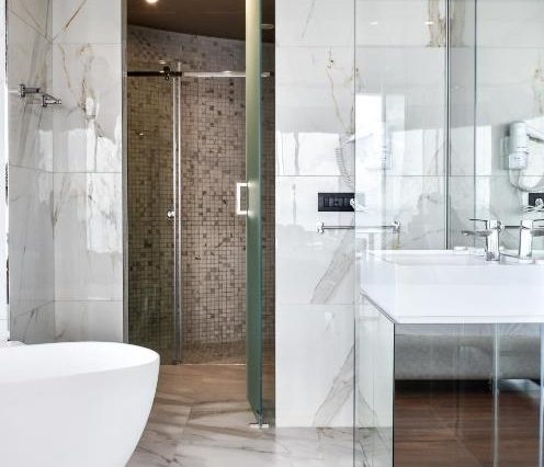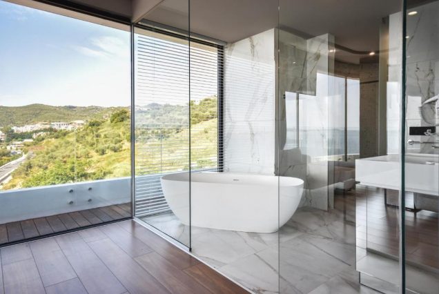 Санузел: ванна с видом, тропический душ, натуральный камень
